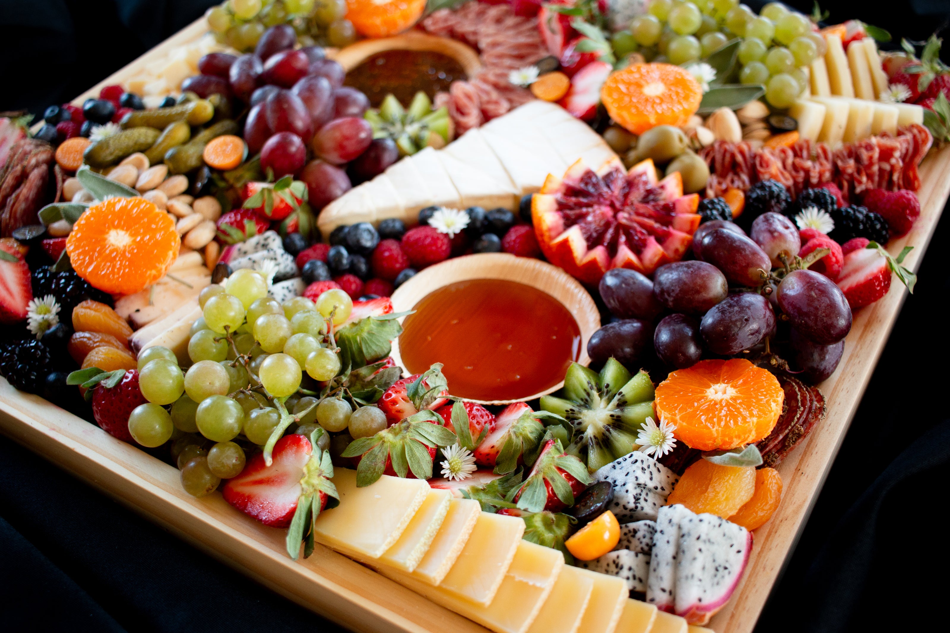 This small charcuterie board includes 5 cheeses, 3 cured meats, honey & 1 spread or jam, seasonal fruits (crudités can be added), pickles & olives, dried fruits & nuts